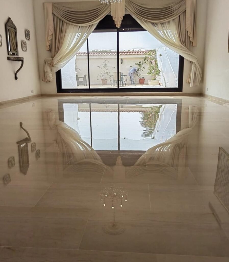 - تلميع الكريستال: تحويل الأرضية الباهتة إلى مرآة عاكسة.